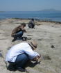 | (1) 化石産地での調査、発掘、クリーニング 私達の主なフィールドは、北九州市小倉北区の藍島、馬島です。 ここは、新生代第三紀漸新世(約3000万年前)の地層で、サメの歯化石や、二枚貝化石などが見つかります。一般の方々と一緒に発掘を行うこともあります。採集してきた化石は、部員によって時間をかけて丁寧にクリーニング(余分な岩石を取り除く作業)されます。 ![]() |